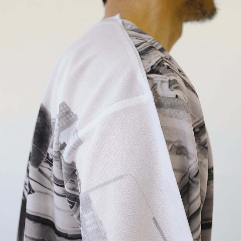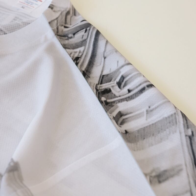 ※プリントの施工方法の都合により、縫い目や折れ目、首リブ、襟下など段差がある部分にプリントが出来ず、白残りになる場合があります。
